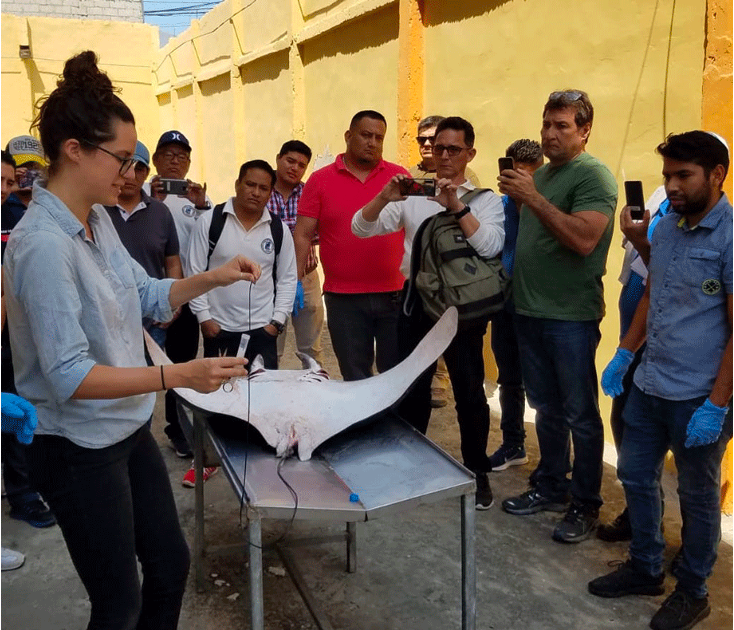 Manta and devil rays (mobulids) are globally threatened species that frequently interact with tropical tuna purse seine fisheries, where an estimated 13,000 individuals are caught as bycatch each year (Croll et al., 2016). In collaboration with the International Seafood Sustainability Foundation, The Manta Trust, and TUNACONS, I led a study to work with tuna vessel crews in the Eastern Pacific Ocean to identify key barriers to safe mobulid release and surface fisher-informed solutions (Cronin et al., 2022 ICES Journal of Marine Science). Using surveys and focus groups, we found that most mobulids are only visible to fishers after capture—underscoring the need for post-capture interventions—and that existing gear often lacks the equipment needed for safe release of large individuals. That research provided a model for incorporating fisher knowledge into the design of bycatch mitigation strategies for mobulids.